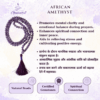 Each bead is made from natural African Amethyst, carefully selected for its rich purple hues and powerful metaphysical properties. The mala can be used for mantras, affirmations, and spiritual rituals, helping you stay grounded and connected to higher consciousness. Amethyst is revered for enhancing intuition, reducing stress, and protecting against negative energies.